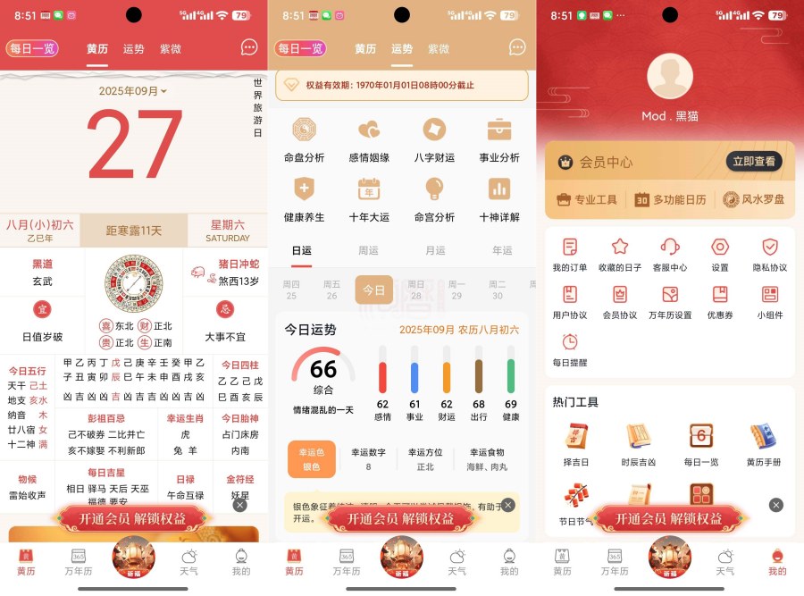 老黄历万年历顺历689解锁会员八字排盘通胜功能全解